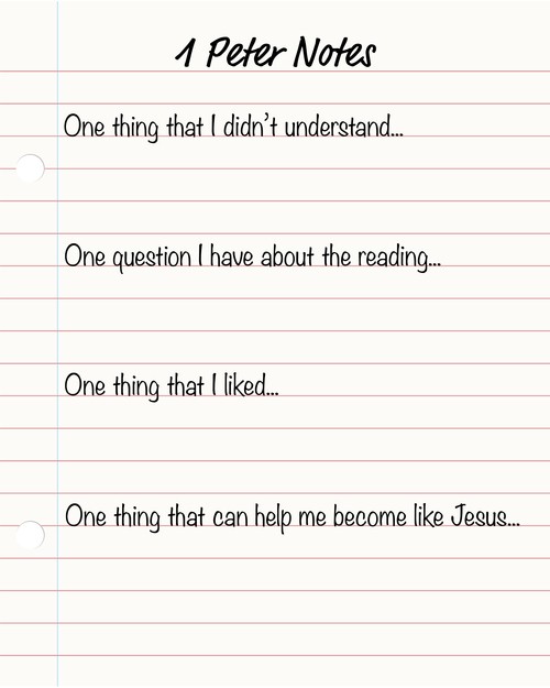Each week, read our short section of 1st Peter before Wednesday night youth group. Write down questions that you have, things you liked, and other things that you noticed in your reading. We will talk about what you noticed in Thursday night small groups. Check out the sample notes here to get inspired as we read together!