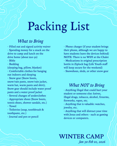 Please drop off your students at Harbor Life Church at 12:00pm on Friday, January 30 for departure, we plan to head out by 12:30. Please make sure that they have eaten already or have food for the road. We expect to return to Harbor Life Church for pickup at 3:30pm on February 1, but our exact arrival time will be dependent upon road conditions. Parents will be updated as we travel home on the 1st.